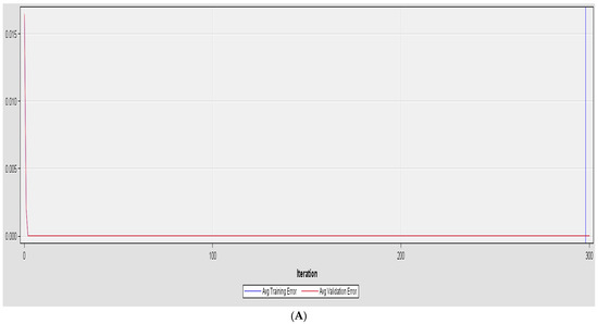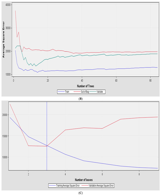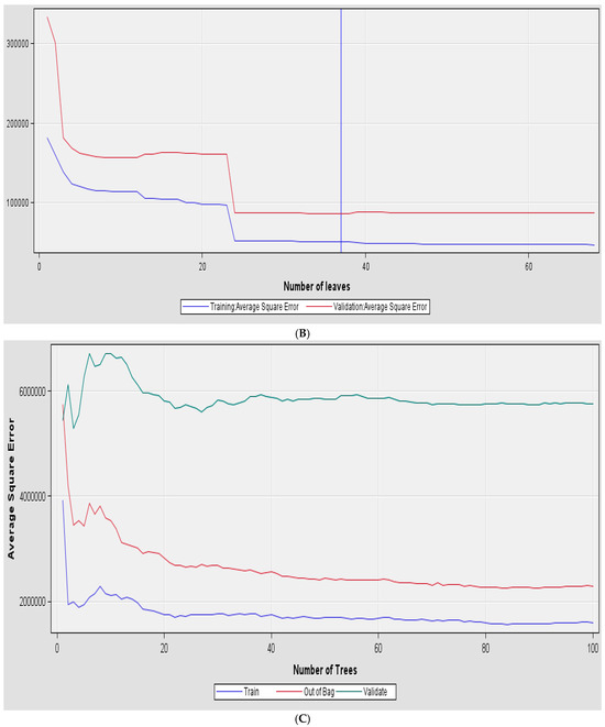 To examine model fits over various levels, the graphs in Figure 1A–C show mean predicted versus actual quarterly cash tax payments at various levels for the decision tree (the decision tree method used in this paper uses the CART (Classification and Regression Trees) algorithm, which is a powerful and widely-used method for building decision tree models. The CART algorithm works by recursively splitting the data into subsets based on the values of input variables, with the goal of creating homogeneous subgroups that are as pure as possible in terms of the target variable. The algorithm selects the best split at each node based on criteria such as Gini impurity or entropy for classification tasks and squared error or mean absolute error for regression tasks. The default splitting criterion is set here to Gini impurity or entropy, which are measures used to evaluate the quality of a split in a decision tree. These criteria help determine how to partition the data at each node to maximize information gain. The maximum tree depth is set to 20 here; this specifies the maximum number of levels or splits that the decision tree can have. This helps to control the complexity of the tree and prevent overfitting. The minimum parent node size is set to the default in the software used; the minimum parent node size specifies the minimum number of observations required in a node to consider splitting it further. This helps to prevent the creation of nodes with too few observations, which may lead to overfitting. Missing values are estimated using imputation. Pruning is set to automatic pruning, where the decision tree is pruned after construction to improve generalization and reduce overfitting. Evaluation metrics used here are accuracy, misclassification rate, and Gini index), neural nets (to avoid overfitting (a potential problem with the modest data size here), input, hidden, and output layers are set to one for all neural net analyses in this paper), and random forest methods (here (and for all analyses in this paper) the CART (Classification and Regression Trees) algorithm is used. This algorithm works by recursively splitting the data into subsets based on the values of input variables, with the goal of creating homogeneous subgroups that are as pure as possible in terms of the target variable. The algorithm selects the best split at each node based on criteria such as Gini impurity or entropy for classification tasks and squared error or mean absolute error for regression tasks. Here, the number of trees is set to 100, and the number of input variables to consider at each split in the decision trees is set to the square root of the total number of input variables (this helps to introduce randomness and reduce overfitting in the model). The random seed (to start the randomization process) is created automatically by the software, and the overall evaluation metrics include measures such as accuracy, misclassification rate, and Gini index), for both training and validation results. Here again, the results show that the decision tree method is the best model fit in terms of error diagnostics.