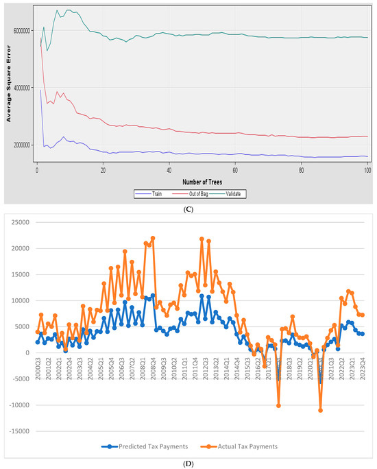 To examine whether the model fits at various levels, the graphs in Figure 4A–C show the mean predicted versus actual quarterly cash tax payments for the decision tree, neural nets, and random forest methods for both training and validation results. Consistent with Table 7, the decision tree method’s mean prediction errors were the lowest. Figure 4D shows actual versus predicted quarterly tax payments over time. As can be seen, the two-track well over time.