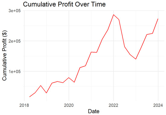 The “Quarterly Profit Over Time” graph (Figure 3) depicts the profit realized at the end of each quarter. The graph shows variability in quarterly profits, with certain quarters experiencing substantial gains while others encounter losses. This variability is typical of stock market behavior and reflects the dynamic nature of the cybersecurity sector. Despite these quarterly fluctuations, the overall trend in profits is positive, contributing to the substantial cumulative profit by the end of the period. Notably, certain quarters, particularly in early 2022, stand out with exceptionally high profits, underscoring the impact of strategic stock selections and key market events during these periods.