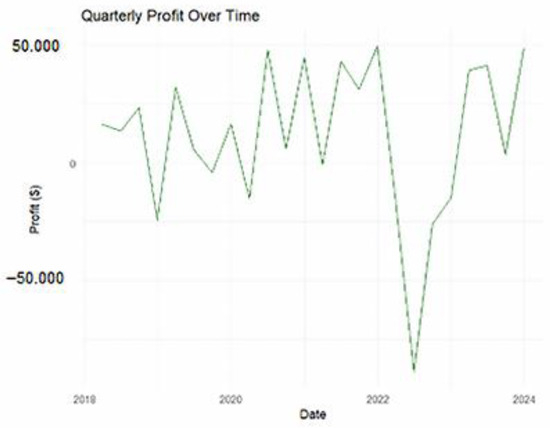 The “Portfolio Value Over Time” graph (Figure 2) illustrates the total value of the portfolio from Q1 2018 to Q1 2024. The graph indicates a consistent upward trajectory, with notable growth around 2021–2022, corresponding to the spike observed in cumulative profit. Periodic dips in portfolio value reflect market corrections, but the overall trend remains positive, highlighting the portfolio’s ability to recover and sustain growth. By Q1 2024, the portfolio value reaches its peak, underscoring the success of the investment strategy and portfolio management over the analyzed period.