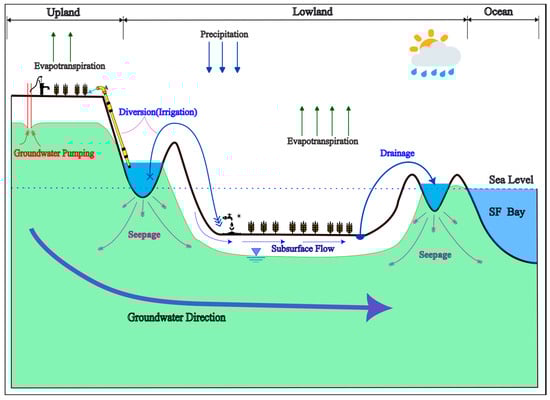 The Sacramento–San Joaquin Delta (Delta), located around the confluence of the Sacramento and San Joaquin Rivers, is one of the most crucial estuarine environments in the western United States (Figure 1). Around 6000 years ago, during the last glaciation, the Delta was created as the rising sea levels submerged the confluence of the Sacramento and San Joaquin Rivers upstream of San Francisco Bay []. For thousands of years, sediments have been deposited in the Delta, the lowest point of the Central Valley, by river flows and tidal action. These sediments covered plants and formed thick organic peat soils. However, in the 19th century, the majority of the region was drained, diked, and developed for agriculture, leading to wind erosion and the oxidation of organic peat soils, causing a steady loss of surface elevation. The process of farming has caused peat-rich soils to oxidize and land to sink, with many islands currently positioned 10 to 25 feet below sea level []. Today, around 1100 miles of levees have converted about 283,000 hectares of Delta tidal marsh into farming “islands” [,]. Under normal conditions, the low elevation of the land facilitates the efficient use of siphons to divert water for irrigation, minimizing energy consumption. To remove excess water from the crop root zone, these low-lying islands utilize pumps to return the water to nearby channels. Additionally, the hydrology of Delta islands is influenced by factors such as crop evapotranspiration, seepage through levees, and the interactions between local groundwater and the root zone of the crops []. Water from the Delta is pumped and conveyed through several aqueducts under the two main water supply programs, the Central Valley Project (CVP) and the State Water Project (SWP), to provide for the needs of approximately 30 million people and over 2.4 million hectares of agricultural land. The timing and volume of these diversions are subject to strict regulatory oversight through state and federal administrative directives, aiming to ensure flow and water quality standards within the Delta while also upholding additional protective measures for threatened and endangered species [].