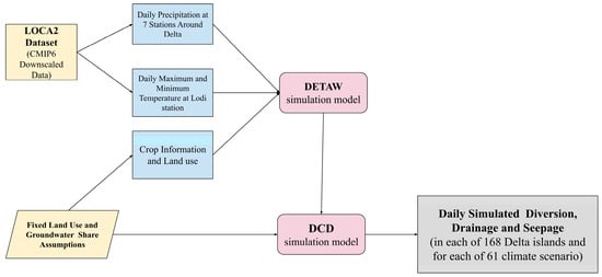 It is worth noting that this study is centered exclusively on exploring hydrological processes within the Delta region. The inflows from upstream basins, specifically the Sacramento and San Joaquin Rivers, as well as the outflow to the San Francisco Bay, are assumed to have no impact on the calculation of hydrological variables in this research. These variables include rainfall runoff, evapotranspiration, and exchanges with surface and groundwater currents. It is essential to highlight that, based on the regulations and criteria dictating the water flow in this region, the water inflow throughout all seasons exceeds the agricultural requirements of the Delta islands. Therefore, the simulations consistently assumed no restrictions on the withdrawal, distribution, or drainage of agricultural water within the Delta. Additionally, for future scenario simulations, we assumed that key agricultural practices—such as groundwater and subsurface contribution rates, land use, and crop patterns—remain fixed at their values from the final year of the historical simulation. To provide a clear overview of the research methodology, a technical roadmap is presented in Figure 3, outlining the key steps and processes involved in this study.