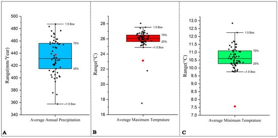 To address the uncertainties associated with the climate scenarios considered in this study, box-and-whisker plots were created to show the projected average annual precipitation (Figure 4A), maximum air temperature (Figure 4B), and minimum air temperature (Figure 4C) for the Lodi station. These diagrams illustrate the uncertainty bounds for each variable, with red circles indicating the historical period averages. The results show that, while the direction of temperature changes follow a consistent upward trend, there is significant variability in precipitation projections. The lack of agreement regarding precipitation trends, including whether average rainfall will increase or decrease, highlights the greater uncertainty associated with this variable. In contrast, temperature projections display a clearer pattern, with changes in average minimum temperatures being particularly notable compared to maximum temperatures.
