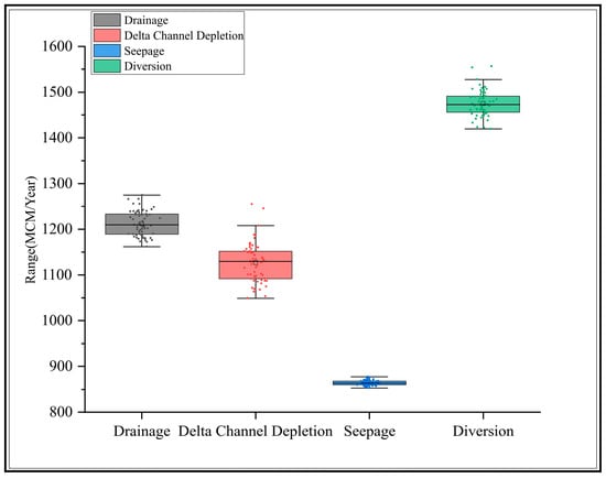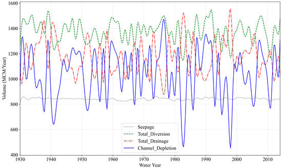 Figure 5 presents the historical (1930–2014) outcomes for annual NCD, seepage, diversion, and drainage. To provide a comprehensive overview of the hydrological simulation outcomes for the historical period, Table 1 summarizes the descriptive statistics. Upon careful examination of the four principal variables—diversion, drainage, seepage, and NCD—it becomes evident that NCD exhibits the most significant variability. The values for NCD span a considerable range, from approximately 450 to 1420 million cubic meters (MCM) per year. This variance highlights the substantial fluctuations that characterize net channel depletion within the studied timeframe (84 years), underscoring its critical role and the complexities inherent in managing water resources in this context.
