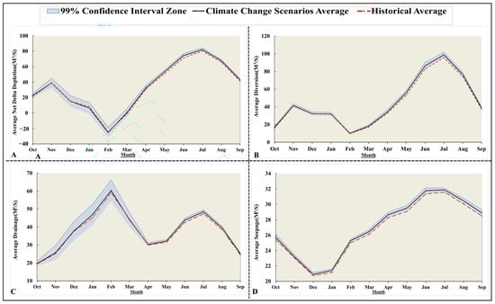 Monthly simulated (A) net channel depletion, (B) diversion, (C) drainage, and (D) seepage (historical average and climate change scenarios average).
