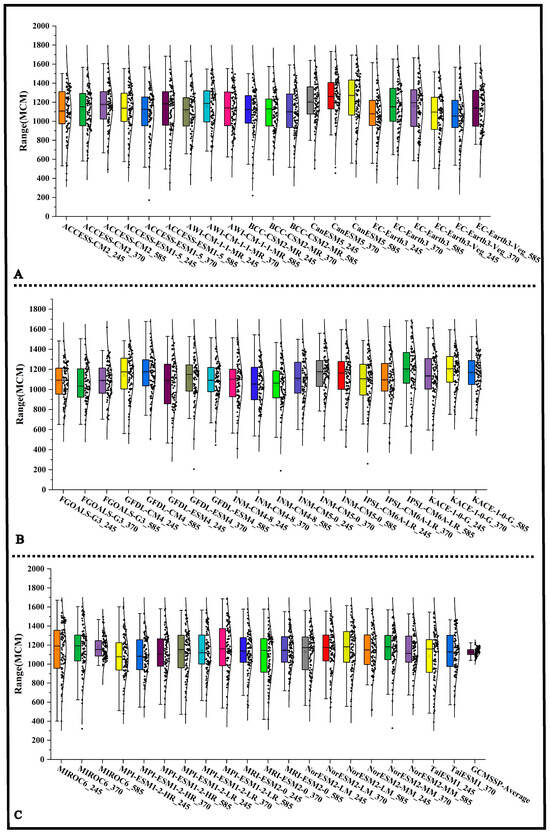 Box-normal diagrams for the net channel depletion resulted from different GCM-Scenarios (subfigures A–C are the same box-normal diagrams for different CMIP6 model and scenarios).