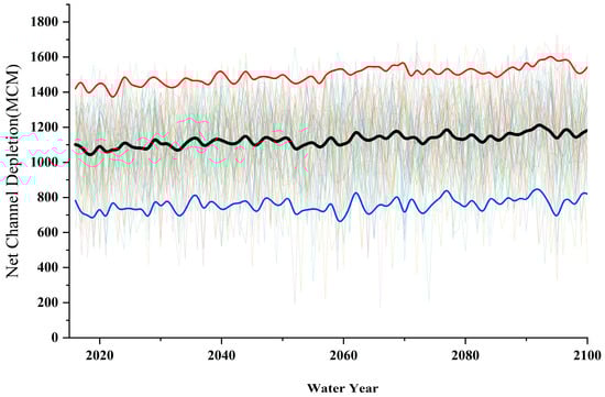Net channel depletion for projected climate trends (black line depicts the average value of all scenarios, and red and blue lines indicate the upper and lower 90% confidence intervals, respectively).