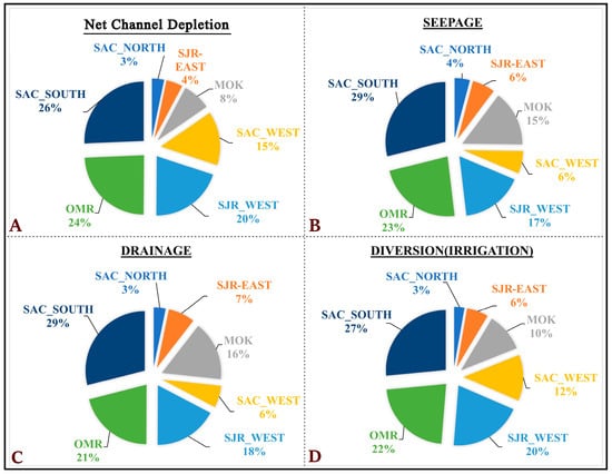 A comprehensive analysis of the regional contributions to the overall average depletion of the Delta, alongside seepage, diversion, and drainage values, was conducted over the historical simulation period. These findings are presented in Figure 10, highlighting the varying degrees of contribution among the seven subregions, distinguished by their respective areas and land use patterns. Notably, the South Sacramento subregion (SAC_South) emerges as the most significant contributor across all four variables examined throughout the Delta, while the North Sacramento subregion (SAC_North) registers the lowest level of involvement. This differential contribution underscores the heterogeneity of regional impacts on Delta water management metrics.