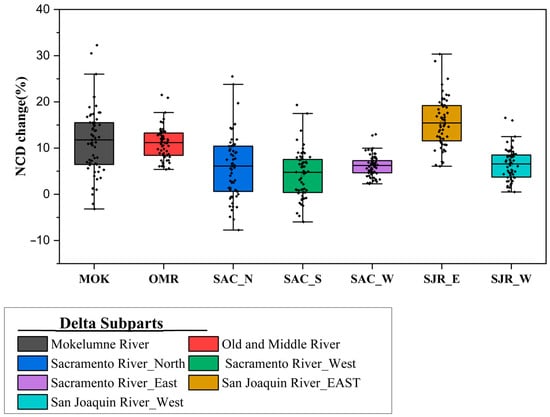 Using historical simulations and future climate scenarios results, we examined annual average variations in four key variables, comparing them to the baseline (historical) period. The results of this analysis for annual NCD are visually represented using box-and-whisker plots in Figure 11, where the vertical axis represents the percentage change of this variable during the future period relative to the average simulated during the baseline period. Across all seven subregions, the average changes in 61 climate scenarios demonstrate a consistent positive trend, ranging from 4.25% in the SAC_South subregion to 15.5% in the SJR_East subregion. Throughout all scenarios, the Old and Middle River (OMR), Sacramento River West (SAC_W), San Joaquin River East (SJR_E), and San Joaquin River West (SJR_W) subregions consistently show positive NCD changes. However, some minor decreases appear in other subregions, i.e., Mokelumne River (MOK) and Sacramento River South (SAC_South). These simulated variations can be attributed to a combination of climatic conditions, geographical features, land use patterns, and cultivation practices. These multifaceted factors collectively contribute to the observed changes in the system.
