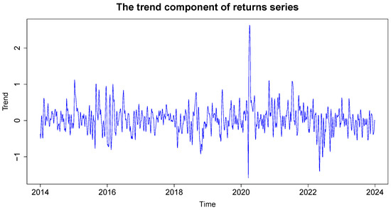 Figure 4 depicts the trend component of the return series, which reflects the long-term movement in the log returns. A noticeable drop around 2020, attributed to the COVID-19 pandemic, is observed, followed by a period of recovery and stabilization.
