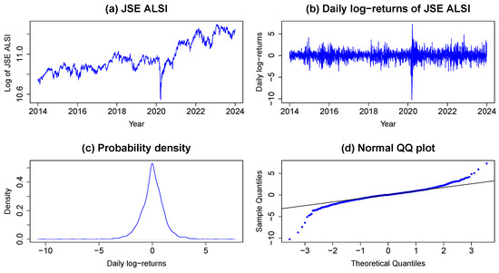 This study uses daily secondary data of the JSE ALSI closing stock prices given in RSA ZAR, which are freely available for use on https://www.wsj.com/market-data/quotes/index/ZA/XJSE/ALSH/historical-prices, (accessed on 7 October 2024). The period of the data ranges from 1 January 2014 to 29 December 2023. The data are collected over a five-day trading week. A comparative analysis is then performed with the JSE Top 40 index, which represents the liquid tradable focus of the South African equity market with a very liquid derivative market. The data for this index can be accessed on https://za.investing.com/indices/ftse-jse-top-40-historical-data (accessed on 15 January 2025). For comparative purposes, we compare our results with a study of the S&P500 index, which represents a developed market. The data can be accessed on https://www.wsj.com/market-data/quotes/index/SPX/historical-prices (accessed on 16 January 2025). For the analysis, daily log returns were utilized and were generated using Equation (1).