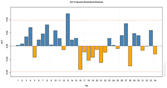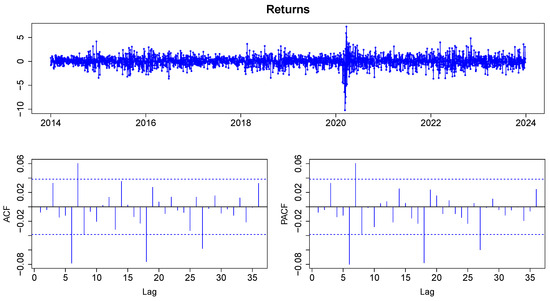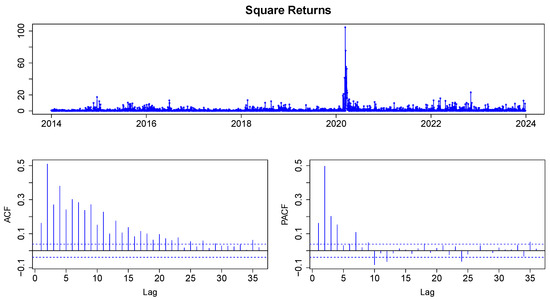 Figure 6 displays the ACF and PACF plots for the return series. The ACF and PACF indicate significant autocorrelation at lags 6, 7, 8, 18, and 27, suggesting that autocorrelation in the JSE index returns is significant. According to Table 4, all Box–Ljung statistics exceed their respective critical values, leading to the rejection of the null hypothesis at a significance level of 0.05. Consequently, we conclude that there is significant autocorrelation present in the returns.