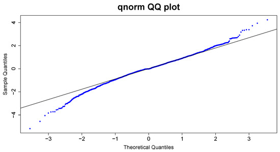 Figure 5a indicates that the daily stock prices exhibit non-stationarity upon visual examination. In contrast, Figure 5b reveals that the logarithmic transformation of stock prices becomes stationary after applying the first differencing. Also, Figure 5b displays the return series, highlighting periods of high volatility and clustering effects. Figure 5c presents a density plot of the return series, which exhibits traits of a leptokurtic distribution. This observation aligns with the findings of the normal Q-Q plot, indicating that the returns do not follow a normal distribution. Finally, Figure 5d illustrates the tails of the quantile–quantile (Q-Q) plot for the daily log return series, which indicates a fat-tailed distribution.
