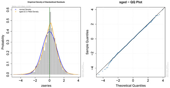 Figure 14 demonstrates that the empirical density better fits the skewed generalized error distribution (SGED) compared to the normal density. The Q-Q plot for SGED illustrates that most data points align closely with the fitted SGED line, though some deviation appears in the tails.