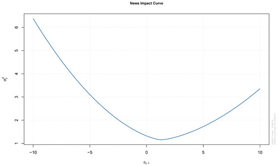 Plot of the conditional variance, , against lagged shocks, , where signifies the arrival of good news and when , represents bad news.