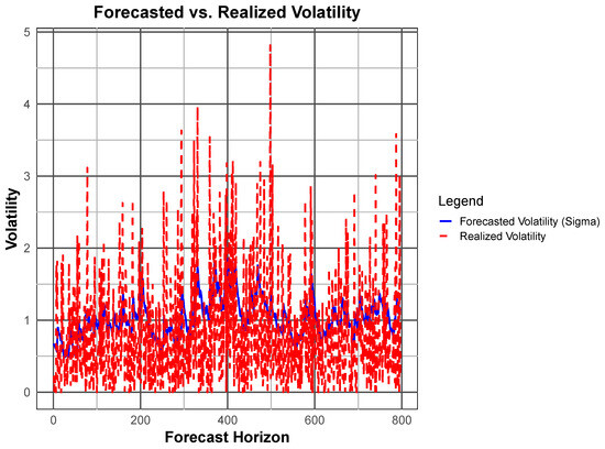Table 19 shows the results of the rolling forecast for the forecasted volatility and realized returns over a 10-day horizon. The forecasted volatility follows a declining trend at first, but it increases sharply on the 9th and 10th days, capturing increased market uncertainty. However, the realized returns are extremely volatile with sudden increases and decreases, i.e., a huge increase on day 7 with a value of 1.7764 and a sharp decline on days 8 and 9 with values of and , respectively. Figure 17 plots this relation, showing that while the model captures general volatility patterns, it does not predict extreme return movements. The noted deviations show that the fGARCH(1, 1) model successfully accounts for the persistence of volatility but fails to satisfactorily account for sudden market shocks.