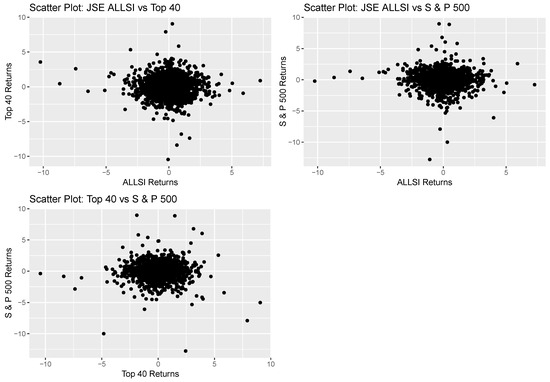A time series plot of the returns of the three indices is given in Figure 18, top panel. Both the FTSE/JSE Top 40 and the S&P500 indices showed increased volatility at the onset of the COVID-19 pandemic, and later, the JSE ALLSI showed similar increases in volatility. A summary of the distribution of the returns is given in Figure 18, bottom panel, which shows the box plots of the three indices. The Top 40 index shows a wider interquartile range, implying inconsistent performance of the index, while the S&P500 has the smallesr index. However, the S&P500 has longer upper and lower whiskers, suggesting the presence of high returns and low returns. However, it has a short box, which suggests a stable period.