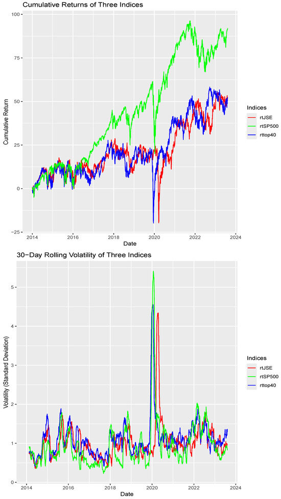 The data were obtained from the Wall Street Journal Markets website https://www.wsj.com/market-data/quotes/index/ZA/XJSE/ALSH/historical-prices (accessed on 7 October 2024), the FTSE/JSE Top 40 from https://za.investing.com/indices/ftse-jse-top-40-historical-data (accessed on 7 October 2024) and the S&P500 index data from https://www.wsj.com/market-data/quotes/index/SPX/historical-prices (accessed on 7 October 2024).