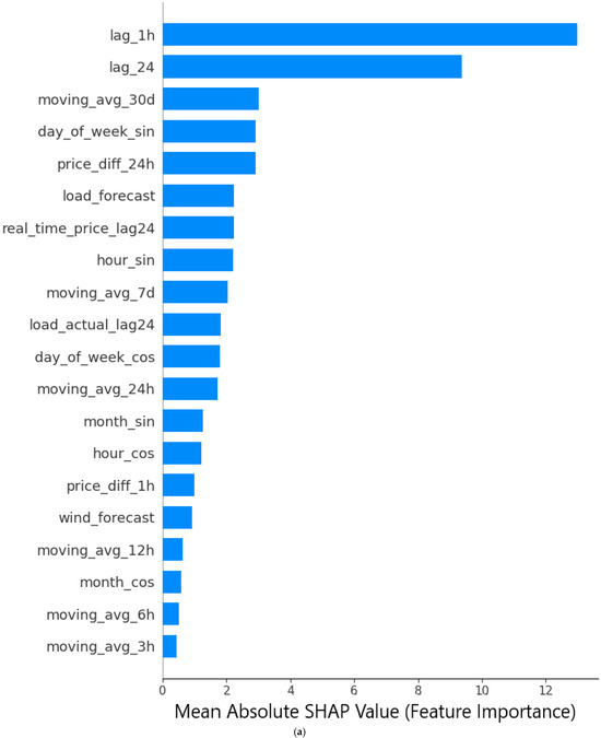 The SHAP analysis showed that predictors such as US federal holidays achieved 0 SHAP values and were removed from the model. The SHAP analysis in Figure 3a provides insight into the feature importance driving the XGBoost model’s predictions of the DAEP, as illustrated in Figure 2. This analysis reveals that historical price lags are the most influential predictors, with the previous hour’s DAEP (lag_1h) exhibiting the highest mean SHAP value, indicating a substantial impact on the model output with a contribution of approximately 12.99 units (i.e., 25.01% of the total contribution). The same hour from the previous day (lag_24) follows closely, contributing around 9.37 units (i.e., 18.10% of the total contribution), highlighting the market’s reliance on short-term and daily recurrent price trends. These findings highlight the inertial nature of energy markets, where recent price movements and diurnal patterns, driven by consistent demand cycles such as morning and evening peaks, play a pivotal role in shaping day-ahead pricing. Engineered features, like the 30-day moving average (moving_avg_30d), contributed moderately, with 3.01 units, i.e., 5.82% contribution, capturing longer-term trends that reflect gradual shifts in market conditions, such as seasonal demand variations or supply availability. Cyclical features, encoded using sine and cosine transformations, further enhance the model’s temporal sensitivity. Sine components, including day_of_week_sin (approximately 2.92 units and 5.63% contribution), hour_sin (approximately 2.21 units and 4.27% contribution), and month_sin (1.26 units and 2.34% contribution), outperform their cosine counterparts (day_of_week_cos, hour_cos, month_cos), suggesting a stronger alignment with peak demand periods, such as midweek for day_of_week_sin, evening hours for hour_sin, and seasonal extremes for month_sin, that drive significant price fluctuations. Additional features, such as price_diff_24h (approximately 2.91 units and 5.63% contribution), load_forecast (approximately 2.23 units and 4.31% contribution), and real_time_price_lag24 (approximately 2.23 units and 4.30% contribution), contribute to detecting short-term shocks, forward-looking demand signals, and immediate supply–demand imbalances, respectively, adding to the model’s predictive capability.