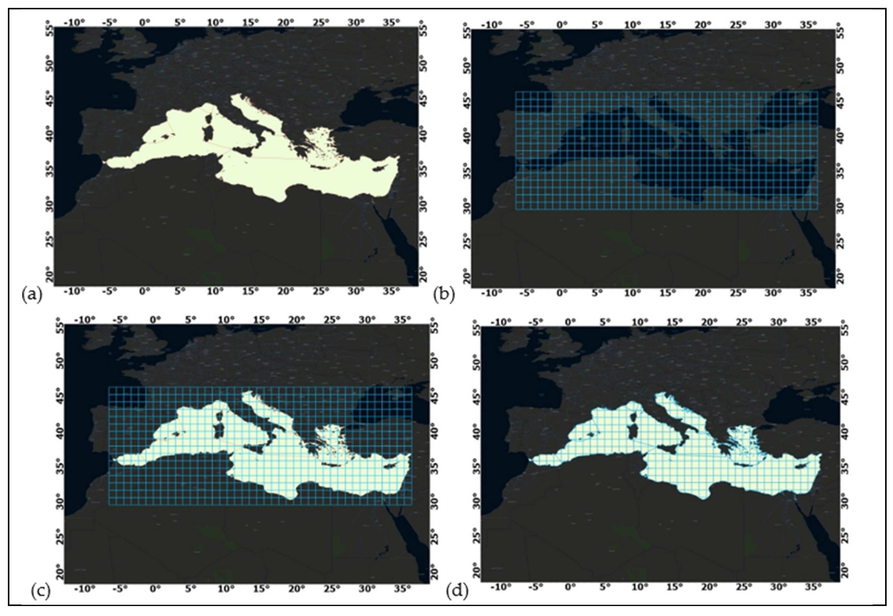 The first stage establishes the intersection of a rectangle that has undergone a tessellation process and the shapefile delineating the area of interest, specifically the Mediterranean Sea, as shown in