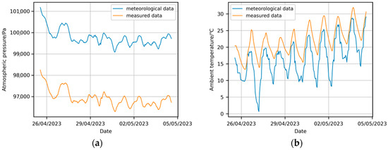 This experiment aims to develop a pressure difference prediction model covering the full flight mission cycle of a stratospheric airship. Due to the absence of subsequent environmental data in the original dataset, meteorological data (atmospheric pressure and temperature with 1 h resolution) from the European Centre for Medium-Range Weather Forecasts (ECMWF), spanning from 25 April to 22 October 2023, was obtained based on the test site coordinates. This data, referred to as meteorological data, was then interpolated to a 10 min time step. A comparison between the actual environmental data from 25 April 2023, 13:25:00 to 4 May 2023, 13:50:00 and the interpolated data revealed a significant discrepancy, as shown in Figure 3.