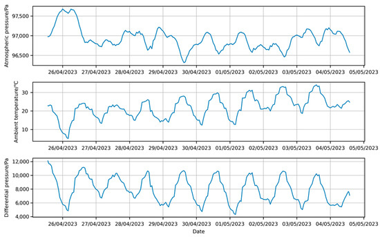 This study’s dataset is sourced from the envelope airtightness ground testing data of a specific airship, collected by the affiliated organization from 13:25:00 on 25 April 2023, to 13:50:00 on 4 May 2023. Figure 1 displays the variation curves of the following parameters from the original data: indoor atmospheric pressure, the difference between the internal gas pressure of the envelope and the external atmospheric pressure, the external gas temperature, and the internal gas temperature of the envelope.