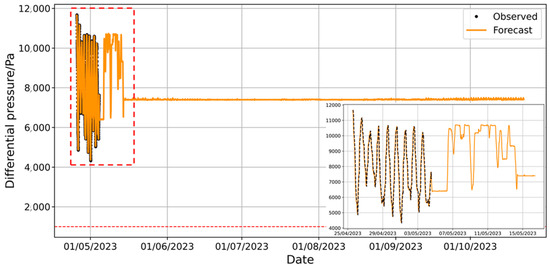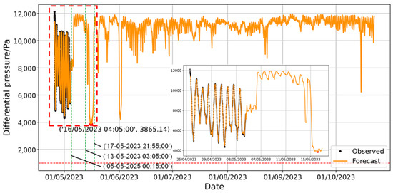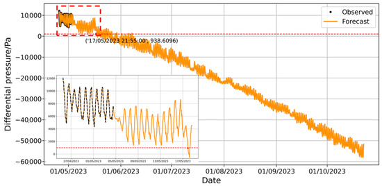 Figure 23 shows that the envelope’s pressure differential is predicted to fall below 1000 Pa at 03:15:00 on 5 October 2023, reaching its lowest value of 91.8 Pa at 04:15:00 on 20 October 2023. Comparing this with the calculated pressure differential curve inside and outside the envelope, the trend and periodic fluctuations of the prediction results from the NeuralProphet model show similarities with the calculated curve, though some discrepancies in the specific numerical values are observed.