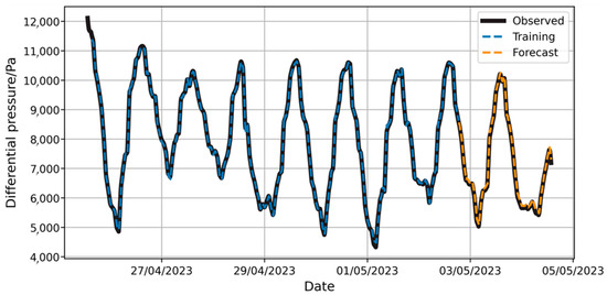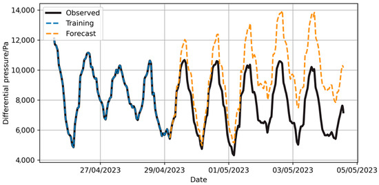 The trend curve in Figure 18 contains significant noise, making it challenging to assess the overall pressure differential trend. A comprehensive analysis of the forecast curve reveals that the diurnal fluctuations in the predicted data are much smaller than those in the observed data, indicating that the model fails to capture the diurnal variation characteristics of the pressure differential with the current training set. Given that the feature distribution in the sample set does not fully align with the training set (Figure 6), it is concluded that the LSTM model is unsuitable for the forecasting requirements in this case. In summary, the interpretability of the LSTM predictions is limited, and it is difficult to analyze the components of the forecast results. When the training dataset is small and there is a distribution shift with the test data, the LSTM model is not applicable.