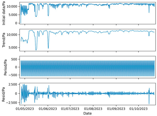 Examining the trend component of the predicted results in Figure 21 reveals that its slope closely mirrors the pressure differential curve in Figure 5. However, it appears largely unaffected by changes in atmospheric pressure and temperature, suggesting overfitting of the training data. To mitigate the influence of the overall trend of the training set on subsequent predictions, the sample set was divided into a 4:6 ratio for training and testing. The results of this sample set are shown in Figure 22.