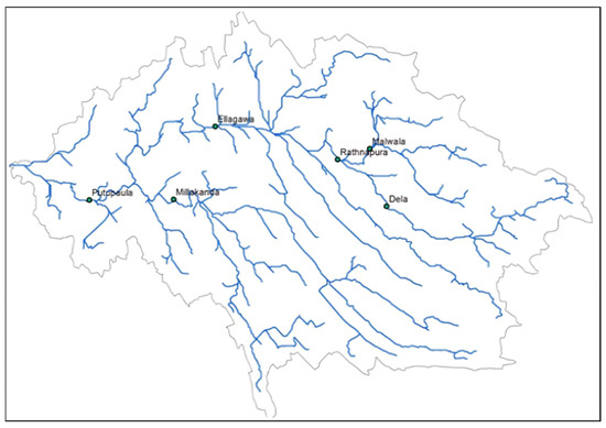The WL gauging stations of the Kalu River Basin [44]. (The direction of water flow (in blue) is from right to left. The upper-stream WL gauging stations, Dela and Malwala, contain missing values for long periods. This made it difficult to build one model that incorporated both stations).