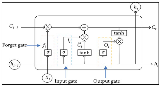 where is the at the forget gate and ; is the weight at forget gate; is the bias at forget gate; is the current input value; is the output at previous moment; is the candidate cell state at the input gate, where is the weight at the input gate; is the bias at the input gate; is the weight at the candidate input gate; is the bias at the candidate input gate; the updated current cell state is ; is the output at the output gate; is the weight at the output gate; is the bias at the input gate; and is the final output of the LSTM [38].