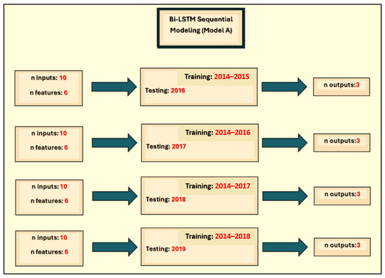 Accurate forecasting of fluvial flood risk for longer periods is usually beyond the scope of possibility due to dynamic weather patterns. Furthermore, alerting residents to flood risk a maximum of 3 days ahead would be sufficient for the vulnerable parties to take necessary actions. Therefore, the forecasting horizons (or n_outputs) of the LSTM models were set to 1 to 3 days ahead. The number of inputs from the six predictor variables to each training iteration (i.e., n_inputs) was 10, as mentioned in Section 3.1. Initially, both Vanilla Bi-LSTM and Stacked Bi-LSTM were employed to forecast WLs at the target station for the years 2016–2019. Table 4 provides the common parameter settings of the Bi-LSTM models, achieved through random search.