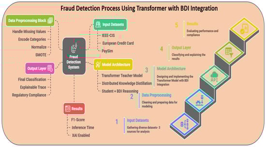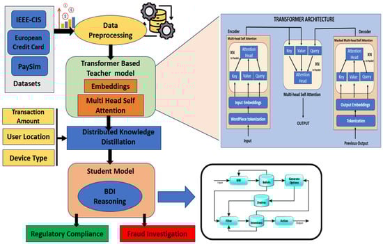 In this work, we present a common framework based on a transformer encoder architecture and multi-teacher distributed knowledge distillation (MTDKD) for financial fraud detection over heterogeneous datasets. Each dataset is paired with a dedicated teacher model trained on its domain-specific distribution. The student model aggregates the distilled knowledge from all teachers to form a generalized representation suitable for cross-domain fraud detection. Figure 1 presents the overall end-to-end framework of the proposed transformer–BDI model for fraud detection. It includes stages such as dataset integration, preprocessing, transformer-based encoding, knowledge distillation, symbolic reasoning through BDI, and final classification and interpretation. As shown in Figure 2, the proposed framework incorporates a transformer-based teacher model, distributed knowledge distillation, and a BDI reasoning layer within the student model, enabling interpretable and regulatory-compliant fraud detection across diverse financial datasets. The methodology unfolds through a structured pipeline comprising six main stages:
