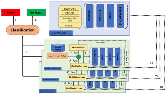 Moreover, we propose a multi-teacher, single-student knowledge distillation approach to transfer the detection capability across a variety of datasets, including the IEEE-CIS Fraud Detection, European Credit Card Transactions, and PaySim Mobile Money Simulation. The goals of this scheme are to enhance the model’s generalization ability and to simplify the model to allow for deployment in a generic financial domain. A schematic of the proposed fraud detection pipeline is discussed in Section 5 (Proposed Methodology) to illustrate the sequential flow from the data preparation to the final classification and explainability.