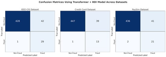 We used three different and publicly available datasets to verify the robustness, transferability, and generalization capacity of the proposed transformer–BDI architecture. These datasets capture all sorts of financial transactions in different avatars—corporate financial transactions, credit card transactions, and mobile money transfers. The large variety of data structures and labels concerning fraud makes it well-suited as a testing ground for the performance of a generic fraud detection system. Table 2 shows a comparison summary of the three datasets used in this paper. Each of the datasets presents distinctive structural and content characteristics that provided the empirical experiment a testing environment in which to evaluate the model under different financial fraud contexts, such as e-trading, credit card operations, and mobile money transactions.