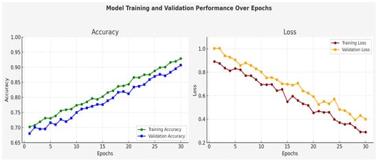 Training and validation performance of the proposed transformer–BDI model across 30 epochs. The left subplot illustrates the accuracy progression, while the right subplot captures the decline in loss, showcasing the model’s learning efficiency and generalization.