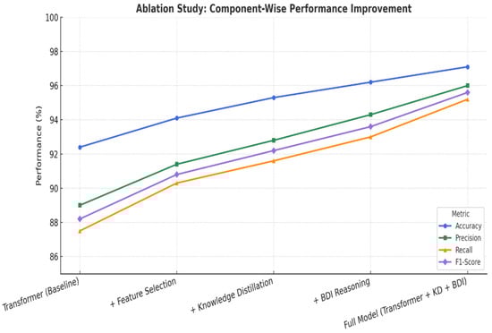 To obtain a rigorous understanding of the individual and cumulative effects of all the intended modules, we conducted a thorough ablation study. We added three components to the base transformer model: feature selection, knowledge distillation (KD), and BDI-based reasoning. The aim was to measure the marginal benefit of each component in terms of the four standard performance measures: the accuracy, precision, recall, and F1-score.