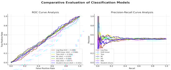 Figure 12 on the left shows comparisons of the ROC and precision–recall curves for different machine learning models, such as logistic regression, SVM, decision trees, random forests, XGBoost, AdaBoost, and the new transformer–BDI (student) model. While the traditional classifiers hover around chance-level AUC values (e.g., Log Reg = 0.484, XG = 0.499), the proposed model achieved a slightly superior AUC of 0.501, indicating consistent albeit modest improvements in distinguishing between fraudulent and non-fraudulent transactions.
