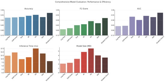 Figure 13 provides a bar-chart-based summary across five evaluation metrics—the accuracy, F1-score, AUC, inference time, and model size. Notably, the student (transformer–BDI) model outperformed all the baseline methods in terms of the classification accuracy and F1-score while remaining computationally efficient with the lowest inference time (≈ 8.4 ms) and a compact model size (~3.5 MB). This confirms its viability for real-time deployment in resource-constrained environments without compromising the predictive accuracy.