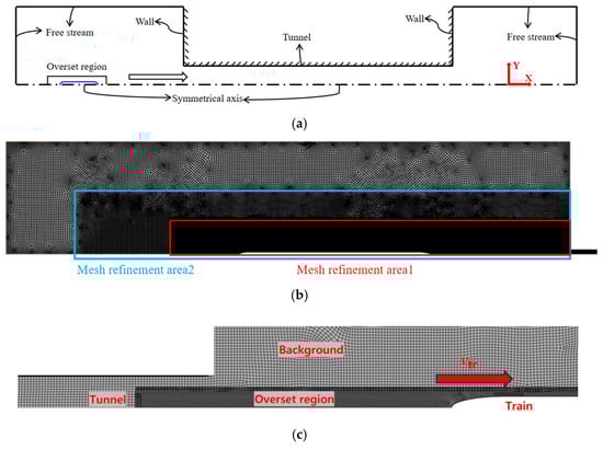 According to relevant studies [], a two-dimensional, revolving–axisymmetric train/tunnel model offers significant advantages in computational efficiency while maintaining a high level of accuracy comparable to that of three-dimensional simulations. Therefore, in this study, a two-dimensional, revolving–axisymmetric train/tunnel model is adopted to perform numerical simulations on a full-scale high-speed train. The SST is adopted to simulate the turbulent flow field, given its proven robustness and computational efficiency in predicting the aerodynamic characteristics of high-speed trains, and this is combined with an all-y+ wall treatment approach and an all-wall treatment approach to ensure the accurate capture of near-wall flow characteristics. The numerical simulations are performed using a finite volume method (FVM), with second-order spatial discretization schemes applied to enhance the solution accuracy. Temporal discretization is conducted using an implicit unsteady solver to ensure numerical stability during the simulation of transient pressure variations. The computational domain incorporates three types of boundary conditions: free-stream boundaries, wall boundaries, and overset mesh boundaries. Specifically, the tunnel walls and train surfaces are defined as wall boundaries, the region surrounding the train body is treated with overset mesh boundaries, and the remaining domain is designated as free-stream boundaries. At the free-stream boundaries, the inflow velocity is set according to the air velocity far away (e.g., 0 m/s), and the pressure is initialized at atmospheric conditions. Turbulence is specified using the intensity–length scale method, with a turbulence intensity of 5% and a length scale of 0.07 times the tunnel hydraulic diameter. The free-stream condition ensures realistic external flow behavior and avoids non-physical reflections. Combined with the overset mesh method, it enables the accurate simulation of the train’s movement and pressure wave propagation in the tunnel. The train model consists of eight carriages, with a total length of = 201.4 m, a cross-sectional area of = 11.85 m2, and a body height of = 3.7 m. Following industry standards, the computational domain is constructed as shown in Figure 1a to minimize boundary effects and ensure sufficient flow development. The computational domain height is set to 31.25 , with a distance of 600 from the tunnel entrance to the upstream boundary and 300 from the tunnel exit to the downstream boundary. This domain configuration effectively minimizes boundary-induced disturbances to the main flow region, thereby enhancing the accuracy and physical reliability of the simulation results.