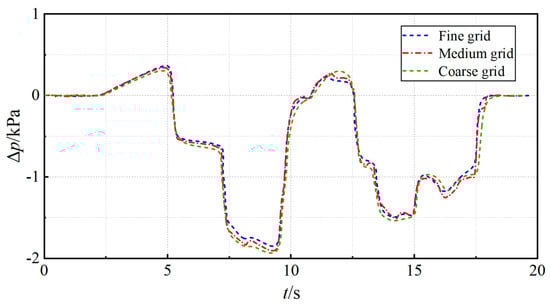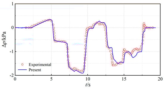 To verify the accuracy and applicability of the established numerical model, the full-scale experimental data of a high-speed train reported in Ref. [] were selected for comparison. The test conditions were as follows: a train speed of 250 km/h, a tunnel length of 1080 m, and a tunnel cross-sectional area of 92 m2. The pressure monitoring point was located on the train surface, 38 m from the train head. The pressure variations on the train surface during tunnel entry and passage obtained from the numerical simulation in this study were compared with the experimental measurements. The comparison results are shown in Figure 3. As shown in Figure 3, the numerical simulation results demonstrate a high degree of consistency with the experimental data in terms of the overall trend of pressure fluctuations, with the primary characteristic points closely matching.