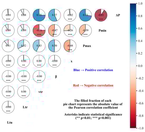 The Pearson correlation coefficient ranges from [−1, 1], where values closer to 1 indicate a strong positive linear relationship between variables, values closer to −1 suggest a strong negative linear relationship, and values near 0 imply little to no linear association between the variables. Based on the correlation coefficient formula defined in Equation (7), Figure 4 presents the correlation matrix, illustrating the relationships among all variables. A pie chart representation is used to intuitively convey both the strength and direction of pairwise correlations. Each label (e.g.,,,) denotes a specific variable. The color of each pie segment indicates the direction of the correlation—blue signifies a positive relationship, while red denotes a negative one. The filled area of each pie reflects the absolute value of the Pearson correlation coefficient; the closer the value is to 1, regardless of sign, the stronger the linear association. Moreover, asterisks are used to mark statistical significance, * for p < 0.05, ** for p < 0.01, and *** for p < 0.001, facilitating the assessment of the reliability of each correlation.