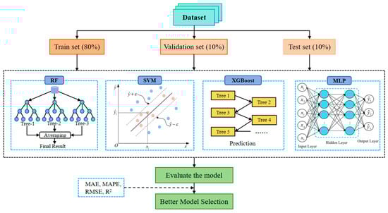 In regression tasks, machine learning models are generally categorized into linear regression, tree-based models, support vector regression, and neural networks. Given the pronounced nonlinear relationship between the external pressure amplitude and input variables, this study selects representative algorithms with strong nonlinear modeling capabilities from these categories—namely, random forest regression (RF), support vector regression (SVR), Extreme Gradient Boosting (XGBoost), and Multilayer Perceptron (MLP)—to construct predictive models for pressure amplitude. To ensure effective training and fair evaluation, the dataset is randomly partitioned: 80% is used for training, 10% for validation to optimize hyperparameters, and the remaining 10% for testing the generalization performance of the models. This split enhances the training stability and ensures predictive reliability on unseen data. The modeling procedures for the four algorithms are illustrated in Figure 5. All the machine learning models were developed and evaluated using MATLAB R2023b’s built-in toolboxes, which provide robust functions for training, validating, and comparing regression algorithms. By comparing their predictive performance on the same dataset, this study systematically evaluates the accuracy differences across models, thereby identifying the most suitable regression approach for the given task. The results provide a theoretical foundation and methodological reference for subsequent model optimization and practical application. The theoretical basis for the four regression models (random forest, support vector regression, MLP, and XGBoost) is presented in Equations (8) and (9). These formulations are critical for constructing and training the models discussed in Section 5.1. The following subsections briefly introduce the core principles of each model.