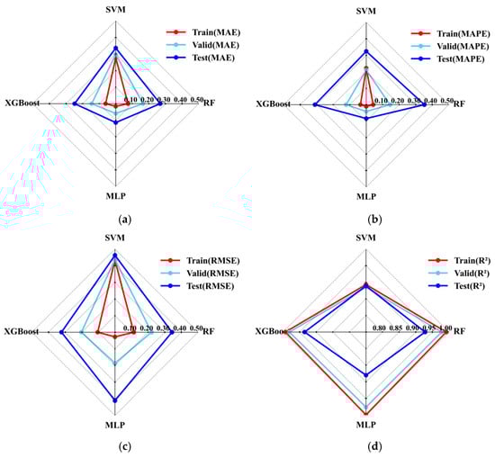 Prediction performance comparison of different machine learning methods. (a) Radar plot of MAE values for different models on training, validation, and test sets. (b) Radar plot of MAPE values for different models on training, validation, and test sets. (c) Radar plot of RMSE values for different models on training, validation, and test sets. (d) Radar plot of R2 values for different models on training, validation, and test sets.