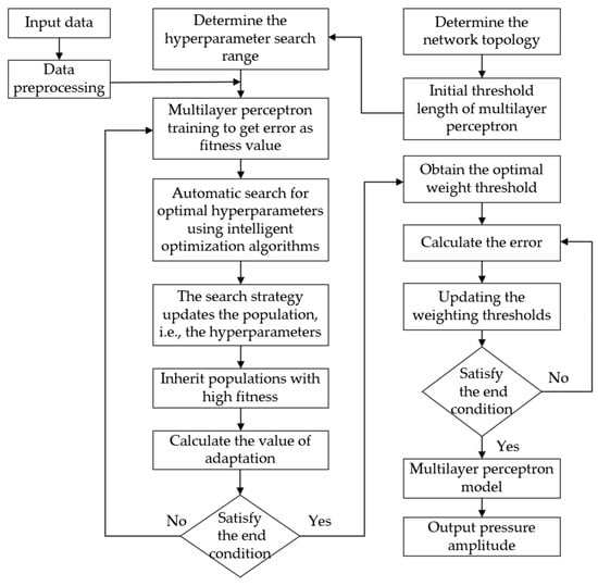 To further improve the prediction accuracy and generalization capability of the MLP model, this study introduces intelligent optimization algorithms to enhance both its architecture and hyperparameter settings. Specifically, adaptive optimization techniques, such as the sparrow search algorithm (SSA) [], Simulated Annealing (SA) [], Particle Swarm Optimization (PSO) [], the Snake Optimization Algorithm (SOA) [], and the Sine–Cosine Algorithm (SCA) [] are employed to automatically tune key hyperparameters, including the number of hidden layers, the number of neurons per layer, and the regularization coefficient. This approach aims to mitigate the limitations of manual parameter tuning, accelerate convergence, and improve the overall stability of the model. The optimization workflow of MLP using intelligent algorithms is illustrated in Figure 7.