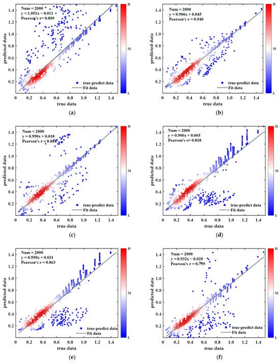 A scatter plot of the true versus predicted values for the model on the test set, illustrating the data density and the linear regression fit. (a) MLP; (b) SSA-MLP; (c) SA-MLP; (d) PSO-MLP; (e) SOA-MLP; (f) SCA-MLP.