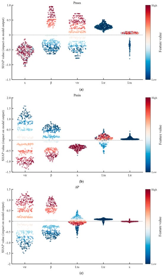 To enhance the model’s interpretability, the SHAP method is employed, grounded in cooperative game theory. Its mathematical basis is detailed in Equation (16), which underpins the analysis results shown in this section. To further explore the influence of each input feature on the SSA-MLP model’s prediction of the external pressure amplitude, SHAP values are used for the interpretability analysis of the model results, as shown in Figure 9. The horizontal axis represents the input features, while the vertical axis shows the SHAP values, reflecting the contribution of each feature to the model output. A larger SHAP value indicates a greater positive contribution of the feature to the prediction, whereas a smaller SHAP value represents a negative contribution. The color of the points indicates the feature’s value, with red representing higher values and blue representing lower values.