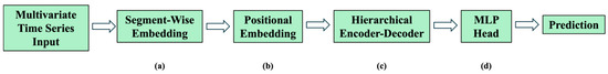 Overall architecture of our Method: (a) Segment-Wise Embedding, (b) Positional Embedding, (c) Hierarchical Encoder–Decoder (HED), (d) MLP Head.
