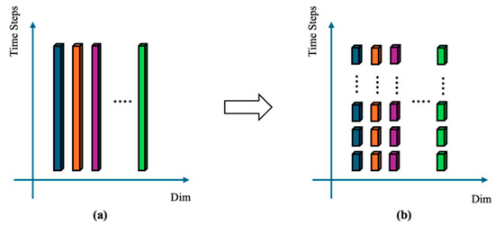 A multivariate time series in a time step is represented by a vector where T is the number of time steps for history and D is the dimension or number of univariates for MTS. Like Transformers for the previous state of the art [5,8,9,10,11,12,13,14], MTS is embedded into large dimensions before the stage of attentions that capture dependencies across time. That is, given input MTS in a time step T, the algorithm embeds the time series point at each time step into an embedded vector: , , where , and represent the vector for time series and embedded vector at time t. Thus, an MTS is embedded into T vectors . Figure 2 below shows the process of segmentation for embedded vectors.