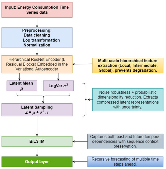 We propose a novel hybrid framework, TVRN, that combines a ResNet-embedded VAE with a BiLSTM network for accurate energy demand forecasting. The overall structure is illustrated in Figure 1. The process begins with data preprocessing, where raw energy demand signals undergo logarithmic transformation and normalization to stabilize variance and scale features. The core innovation lies in the ResNet-embedded VAE encoder, which performs hierarchical multiscale feature extraction while simultaneously reducing dimensionality and suppressing noise. ResNet starts its hierarchical extraction with the initial layers, which detect local features such as short-term fluctuations, spikes, sudden changes, and irregularities. The intermediate layers capture seasonal and cyclical patterns, while the deeper layers identify global features, including long-term trends and notable correlation patterns in energy consumption data. Unlike conventional VAEs that rely on standard feedforward encoders, our model embeds residual blocks within the VAE encoder, which allows the network to train deeper layers without degradation. These skip connections enable efficient gradient propagation and better preservation of both local and long-range feature dynamics in the latent representation. These latent sequences are then fed into a BiLSTM, which leverages both forward and backward temporal dependencies. This allows the model to contextualize each time step using both past and future patterns, particularly beneficial for forecasting complex energy demand signals with multi-seasonal and irregular characteristics. Finally, the BiLSTM’s output is passed through a dense layer and denormalized to produce the final predicted energy consumption values. The TVRN framework thus unifies deep residual feature encoding, probabilistic dimensionality reduction, and bidirectional temporal inference in an end-to-end architecture optimized for energy forecasting.